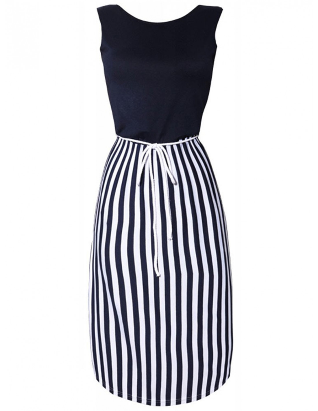 Sukienka jest idealna do stworzenia stylizacji tych codziennych oraz bardziej oficjalnych. Ubierając klasyczne szpilki uzyskasz zjawiskową stylizacje na randkę. Lekką i bardzo kobiecą. Spódnica sukienki jest w jednolitym granatowym kolorze, dołączony został pasek również w stylu marynarskim dzięki któremu bardziej podkreślisz swoja smukłą sylwetkę.