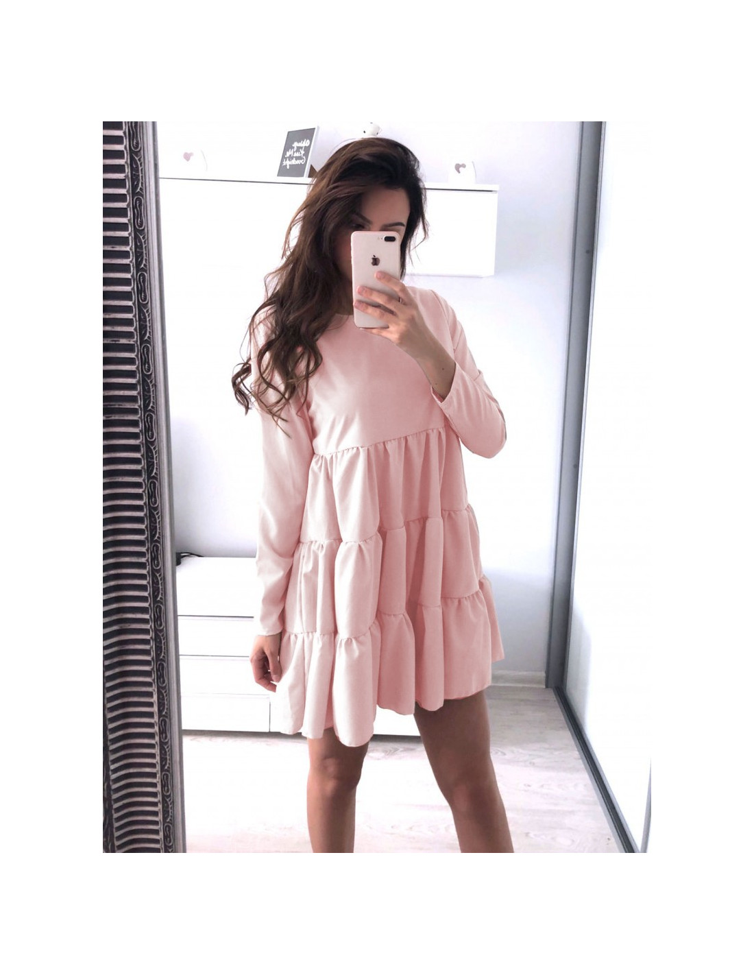 Trapezowa sukienka z falbankami LEXIE - pudrowy róż