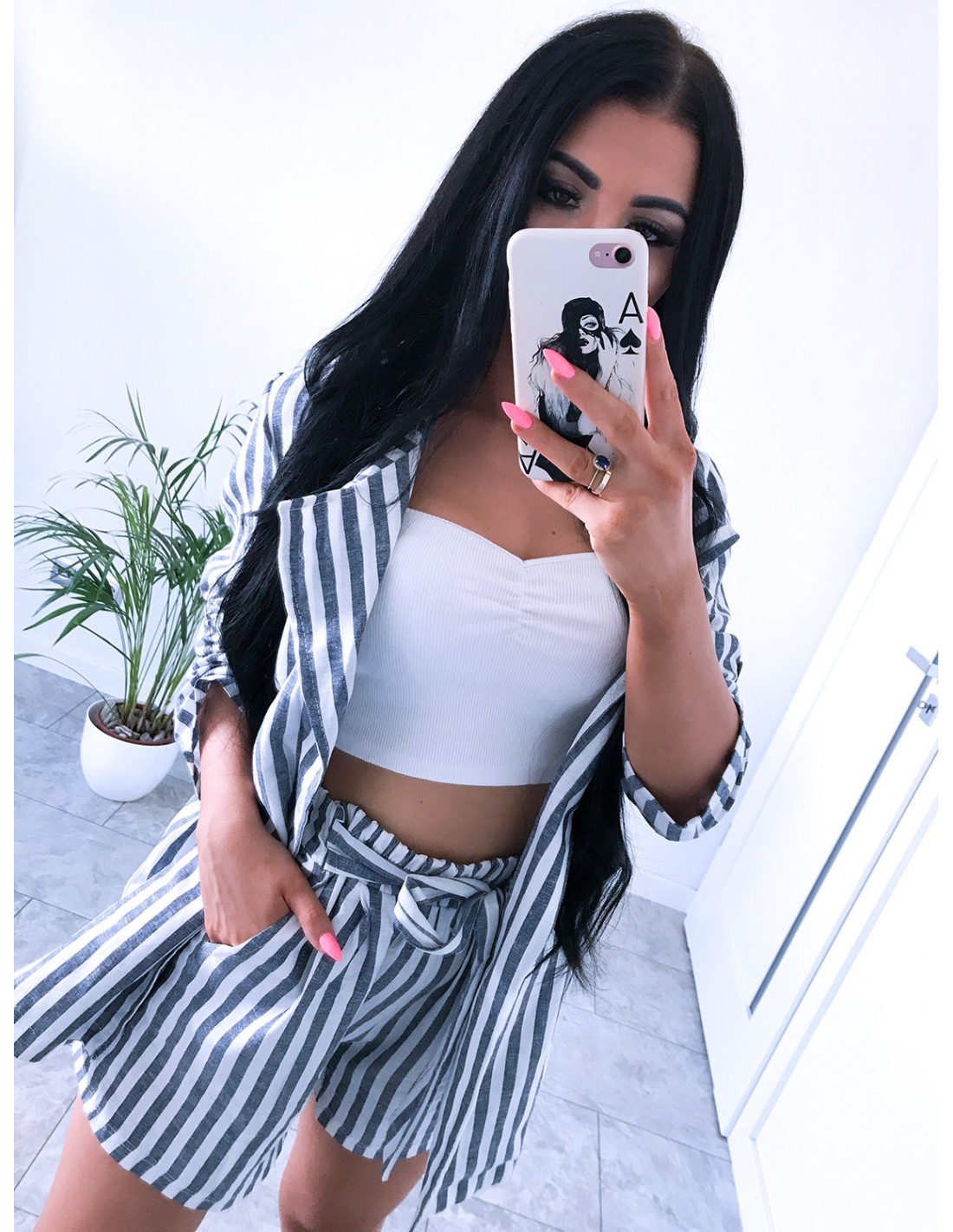 Bardzo modny komplet damski w paski - spodenki z marynarką, z ozdobnymi derwnianymi guzikami.